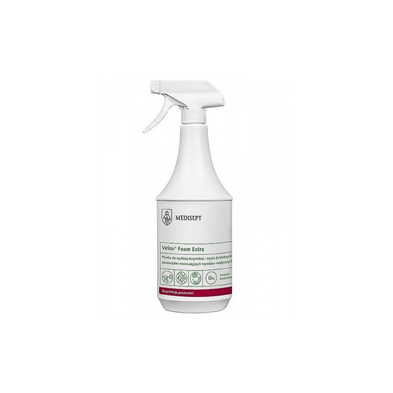 Zastosowanie: Pianka Velox Extra zalecana jest do dezynfekcji różnorodnych powierzchni sprzętu medycznego ze szkła, porcelany, metalu, gumy, tworzyw sztucznych oraz szkła akrylowego i plexi. Może być stosowana na oddziale intensywnej opieki medycznej oraz na bloku operacyjnym, do dezynfekcji aparatury medycznej, sprzętu rehabilitacyjnego, foteli zabiegowych, inkubatorów, głowic USG i lamp. Przeznaczona również do mycia i dezynfekcji wycisków stomatologicznych i protez. Nie zawiera aldehydów i fosforanów, dzięki czemu nie odbarwia dezynfekowanych powierzchni. Posiada przyjemny cytrynowy zapach.Preparat nie wymaga splukiwania. produkt posiada pozytywną opinię Centrum Zdrowia Dziecka.