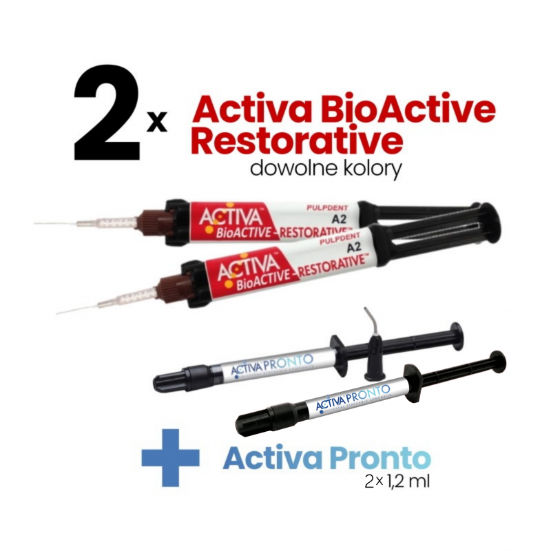 Pakiet zawiera 2x materiał bioaktywny do odbudowy Activa BioActive Restorative (2 strzykawki po 8g) oraz kompozyt typu flow Activa Pronto (2 x 1,2 ml) - w tym samym kolorze.