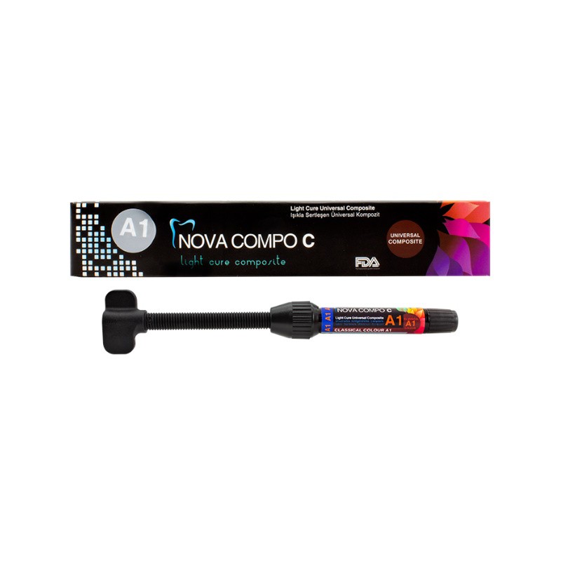 NOVA COMPO C jest to wysokiej gęstości kompozyt, przeznaczony do wypełnienia ubytków wszystkich klas w zębach przednich i bocznych. Zawartość wysokiej klasy monomeru zmniejsza kurczliwość polimeryzacyjną, zapewnia odporność odbudowy na wszelkie naprężenia daje doskonały efekt estetyczny oraz zwiększa stabilność kompozytu.