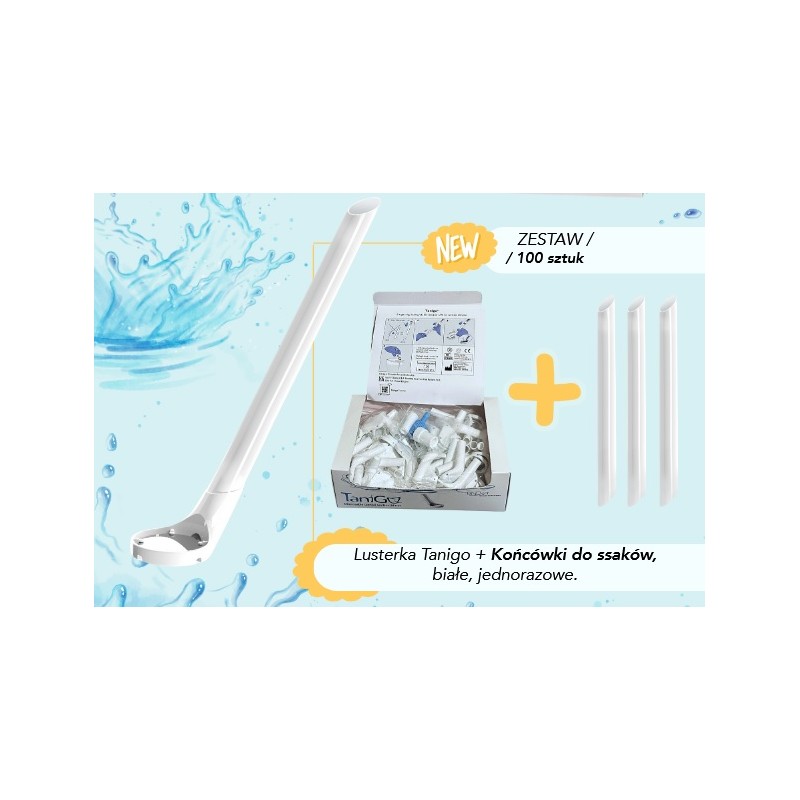 Pakiet zawiera 1 opakowanie lusterek Tanigo oraz 100 sztuk końcówek jednorazowych do ssaka.