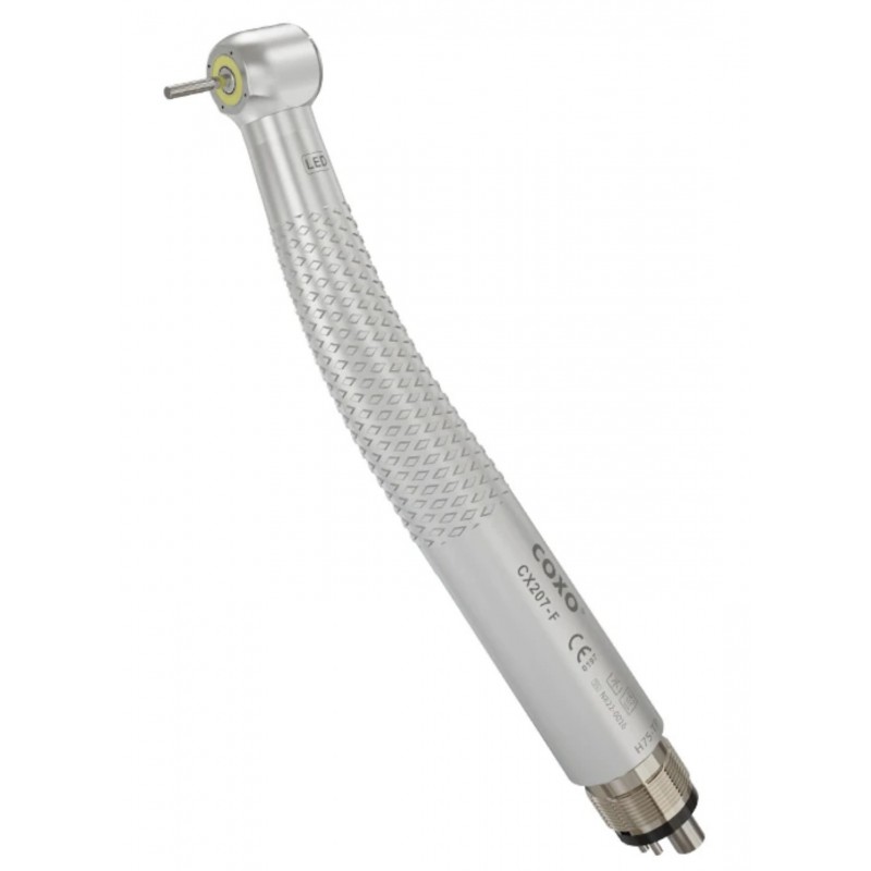 Turbina CX207-F H75 to profesjonalna końcówka stomatologiczna zaprojektowana z myślą o precyzji i wygodzie użytkowania. Dzięki innowacyjnemu pierścieniowi LED, zapewnia bezcieniowe oświetlenie pola pracy, co znacząco poprawia widoczność podczas zabiegów. Czterokierunkowy spray skutecznie chłodzi wiertło, zapobiegając jego przegrzewaniu.