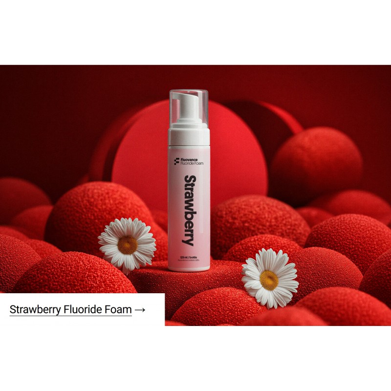 Fluovance Fluoride Foam to nowoczesna - Gęsta, stabilna piana łatwo wypełnia łyżki do fluoryzacji, równomiernie pokrywa zęby i nie daje uczucia „zalewania” jamy ustnej.