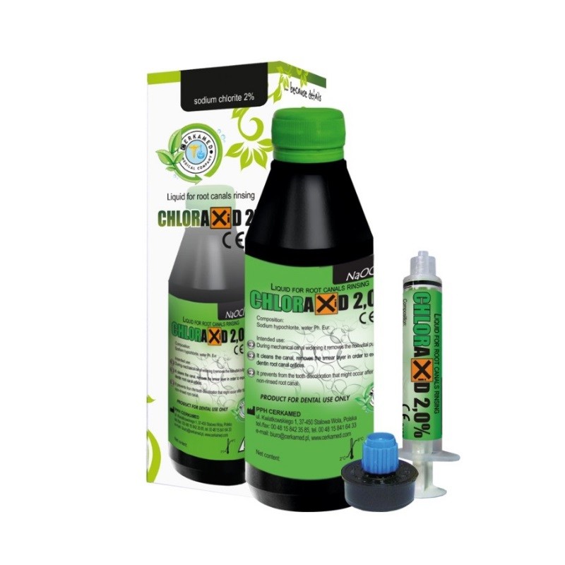 Chloraxid 2,0% ma działanie lityczne w stosunku do martwych i żywych tkanek, rozpuszcza część organiczną warstwy mazistej. Dotyczy to kanału głównego oraz kanałów bocznych, które są niedostępne dla narzędzi. Chloraxid 2,0% posiada właściwości czyszczące oraz działa wybielająco na tkanki twarde zęba.
